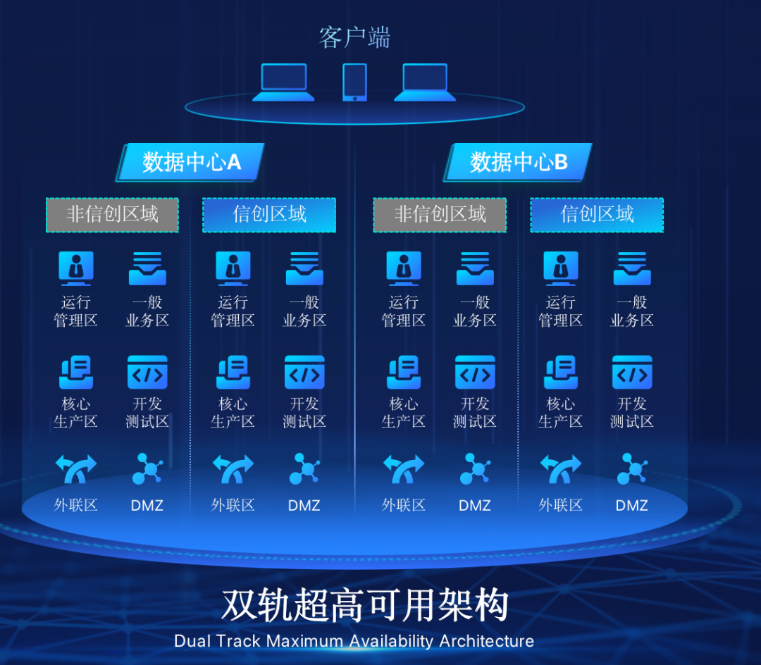 DB电子官网在企业面临自主创新IT基础重构过程中,推出的全新架构双轨超高可用架构(简称DTMAA),在双活数据中心的分区调度基础上,添加每个数据中心内信创域和非信创域的分域调度,来实现分区分域协同的多活双轨超高可用。